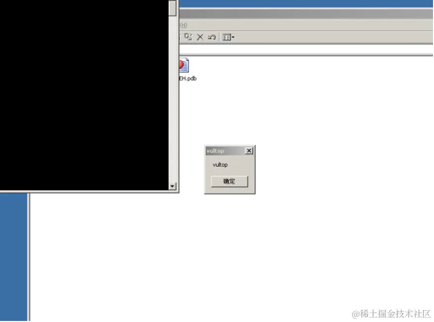 我们发现EBP位置已经被淹没,而SEH处理函数地址已经指向buf的位置,放行程序继续运行,到strcat函数的时候程序会发生异常,调用最近的SEH异常处理函数,这里被我们修改为buf的起始位置,程序运行我们的shellcode,成功弹窗: