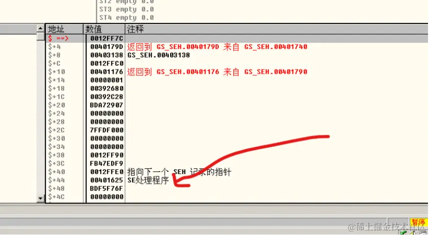我们发现buf位置在0012FEA0,最近的SEH处理函数在EBP+44的位置,即0012FFB4,我们需要通过延迟传入字符串淹没这个地址,让他指向buf的起始位置0012FEA0,我们需要增加字符串0x54字节,并在最后四字节放入0012FEA0。接下来传入构造好的字符串,并生成exe,再根据之前步骤走到strcpy函数之后: