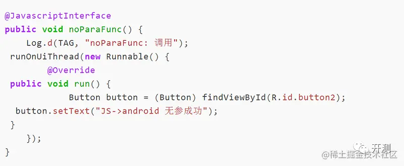 ③在全局桥对象中(这里是MainActivity中)声明js要调用的方法,并加上注解@JavascriptInterface,例如:
