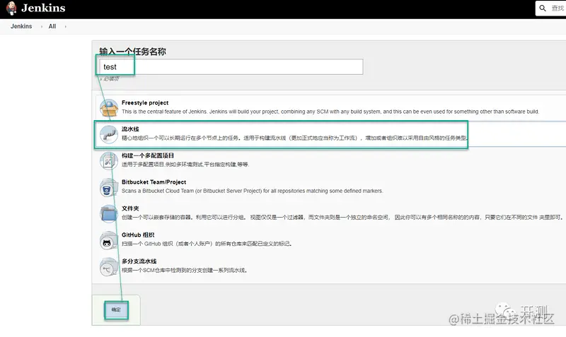 2.跳转到如下界面,输入自己的任务名称和描述信息之后,选择“流水线”选项并点击下方的确定按钮即创建了一个Pipeline任务。