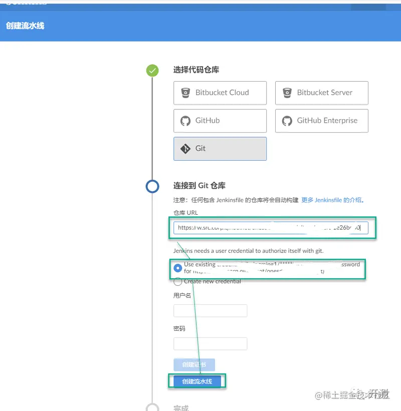 选择代码仓库,填入地址和令牌,创建一条流水线。