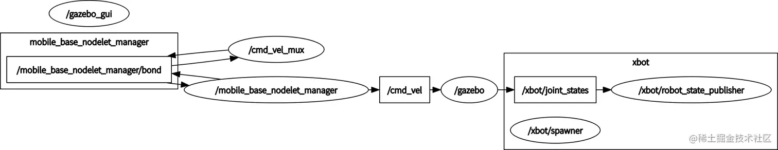 /mobild_base_nodelet_manager接收了/mobile_base_nodelet_manager/bond,同时又发送/mobile_base_nodelet_manager/bond和/cmd_vel两个Topic。对于/gazebo节点而言,同时接收/cmd_vel和发送/xbot/joint_statesTopic。