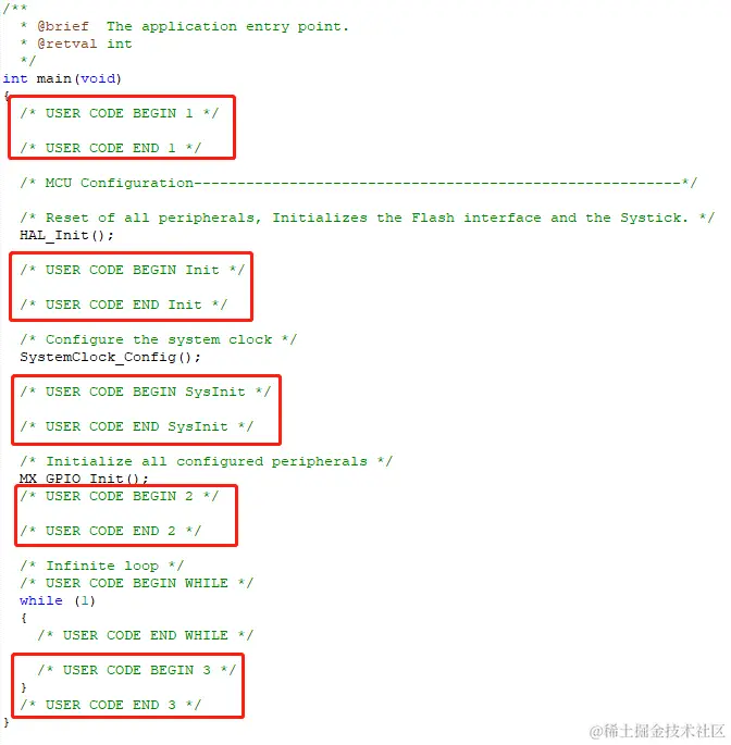 用户代码要加在 USER CODE BEGIN N 和 USER CODE END N 之间,否则下次使用 STM32CubeMX 重新生成代码后,会被删除。