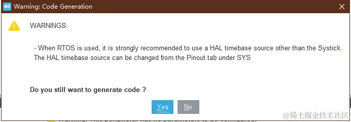 SysTick(滴答定时器) 来维护的,这时就需要考虑 “HAL的时基” 和 “OS的时基” 是否要共用SysTick(滴答定时器) 了。如果共用SysTick,当我们在CubeMX中选择启用FreeRTOS之后,在生成代码时,CubeMX一定会报如下提示: