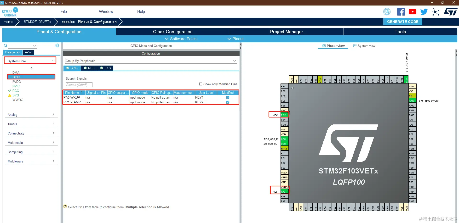 在 System Core 中选择 GPIO 设置。