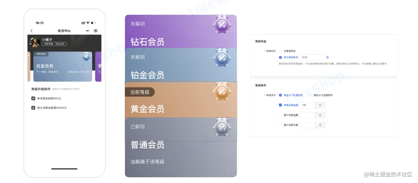 根据成长值来升级等级,不同的会员等级享受的会员折扣不同,等级越高折扣越优惠越大