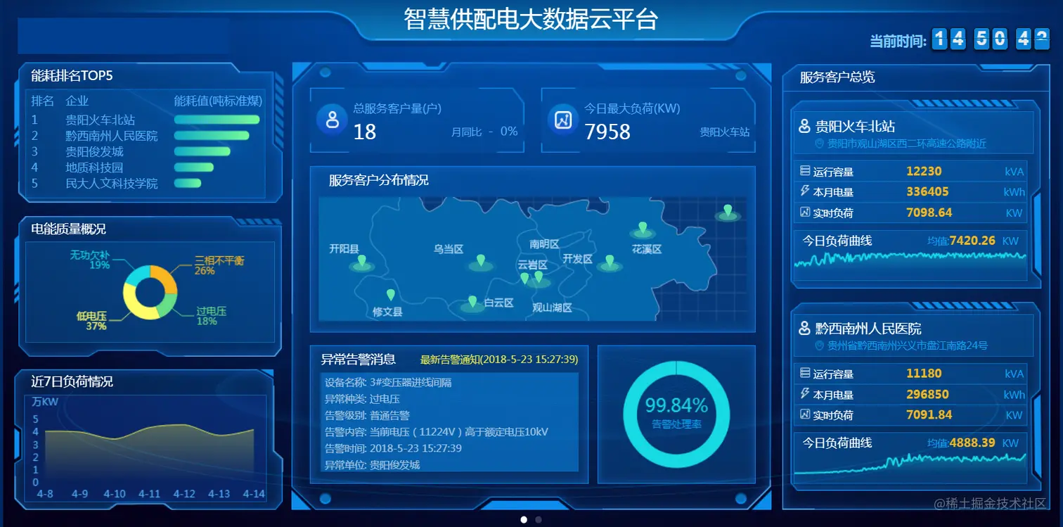 支持基于时间、空间、数据等多个维度,为设备/线路重过载、电压异常、三相不平衡等各类异常事件建立阈值告警触发规则,并支持集成各检测系统数据,自动监控各类数据指标变化趋势,对电网风险隐患进行可视化自动告警。