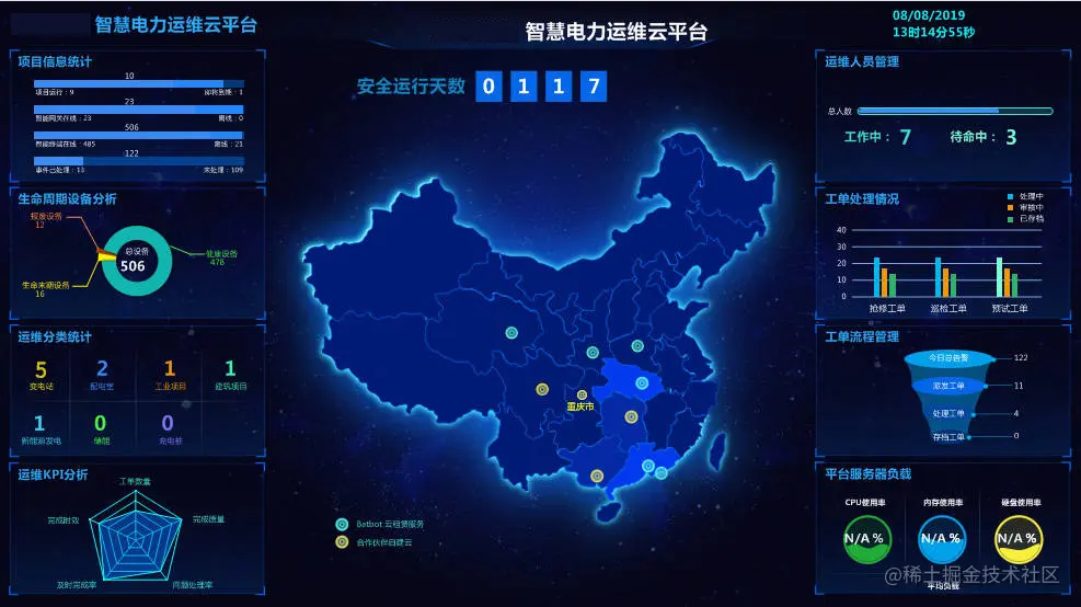 基于地理信息系统,全面展示电力基建工程项目的分布、工程概况(工期、投资规模、参建单位等)、工程进度、人员、车辆、工器具等信息;并可对现场施工安全、进度、质量等进行实时监测,辅助管理部门综合掌握电力工程的总体情况,提升对工程安全和工程进度的监测监管力度。