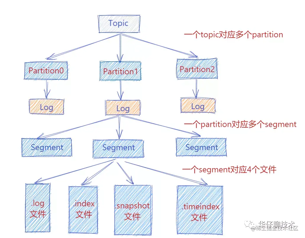 此时 Producer 端生产的消息会不断追加到 log 文件末尾,这样文件就会越来越大, 为了防止 log 文件过大导致数据定位效率低下,那么Kafka 采取了分片和索引机制。它将每个 Partition 分为多个 Segment,每个 Segment 对应4个文件:“.index” 索引文件, “.log” 数据文件, “.snapshot” 快照文件, “.timeindex” 时间索引文件。这些文件都位于同一文件夹下面,该文件夹的命名规则为:topic 名称-分区号。例如, heartbeat心跳上报服务 这个 topic 有三个分区,则其对应的文件夹为 heartbeat-0,heartbeat-1,heartbeat-2这样。