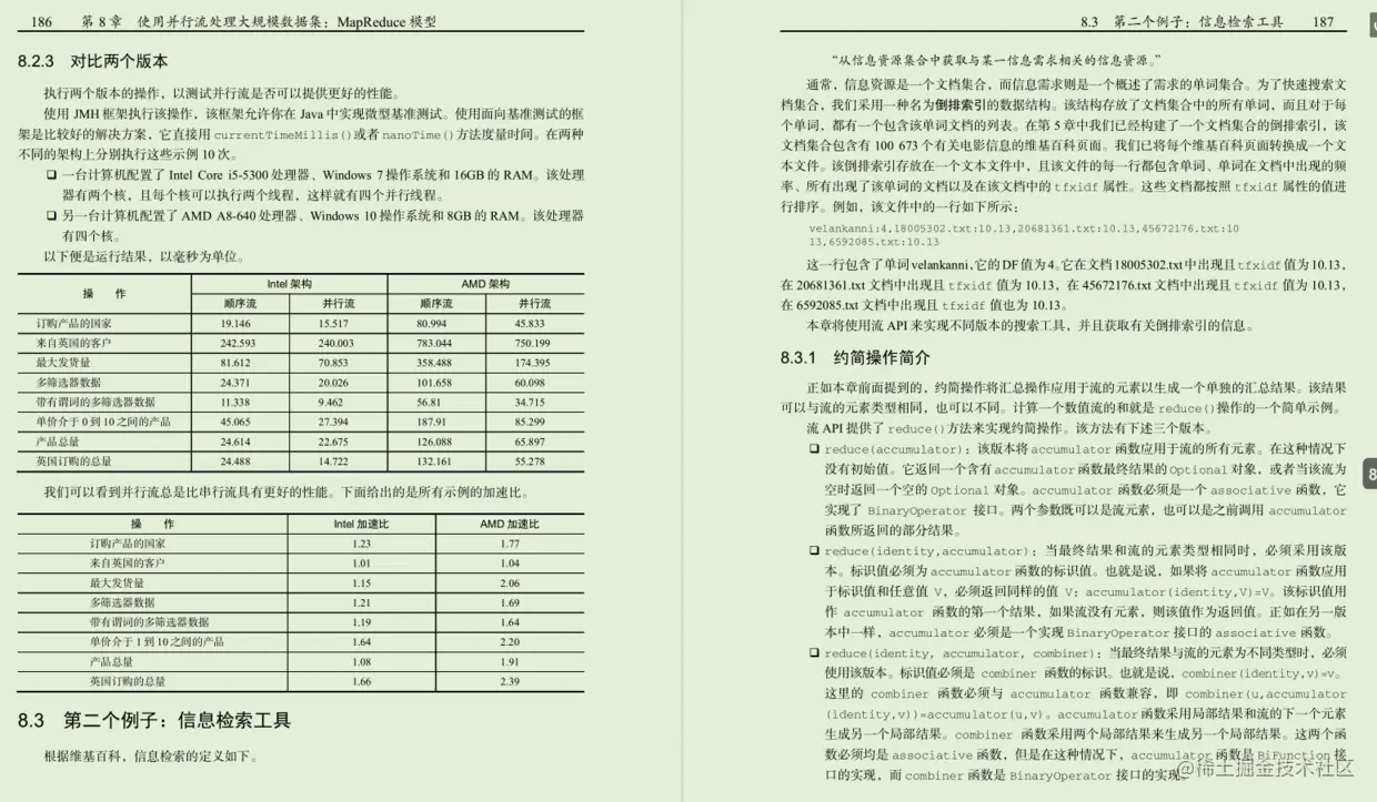 第8章,“使用并行流处理大规模数据集:MapReduce模型”。这一章将介绍如何采用流来处理大规模数据集。你将学习如何使用流API和更多的流函数来实现MapReduce应用程序。你将实现一个数值汇总算法和一个信息检索工具。