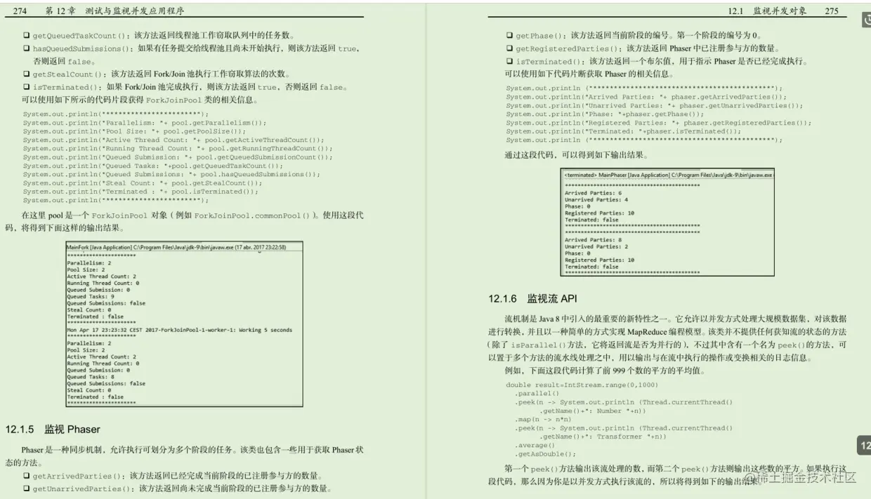 第12章,“测试与监视并发应用程序"。这一章将介绍如何获得Java并发API元素(线程、锁、执行器等)的状态信息。你还将学习如何使用JConsole应用程序来监视并发应用程序,以及如何使用MultithreadedTC库和Java Pathfinder应用程序来测试并发应用程序。