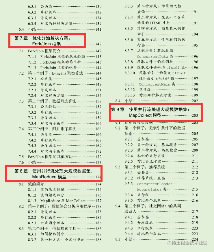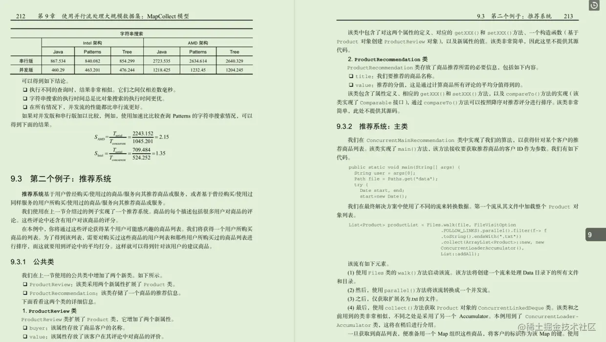 第9章,“使用并行流处理大规模数据集:MapCollect模型"。这一章将探讨如何使用流API中的collect()方法对数据流执行可变约简(mutable reduction)操作,将其转换为一种不同的数据结构,包括在collectors类中预定义的一些收集器。你将实现一个无须建立索引就能够搜索数据的工具、一个推荐系统,以及计算社交网络中两个人的共同联系人列表的算法。