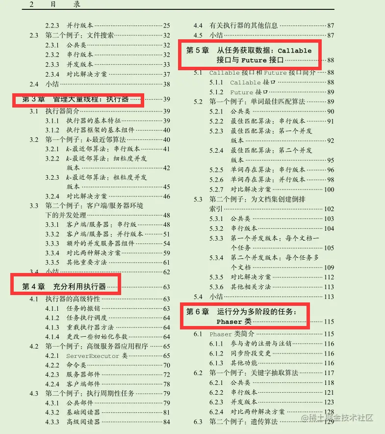第3章,“管理大量线程:执行器”。这一章将介绍执行器框架的基本原理。该框架让你能够使用大量的线程,而无须创建或管理它们。你将实现k-最近邻算法和一个基本的客户端/服务器应用程序。