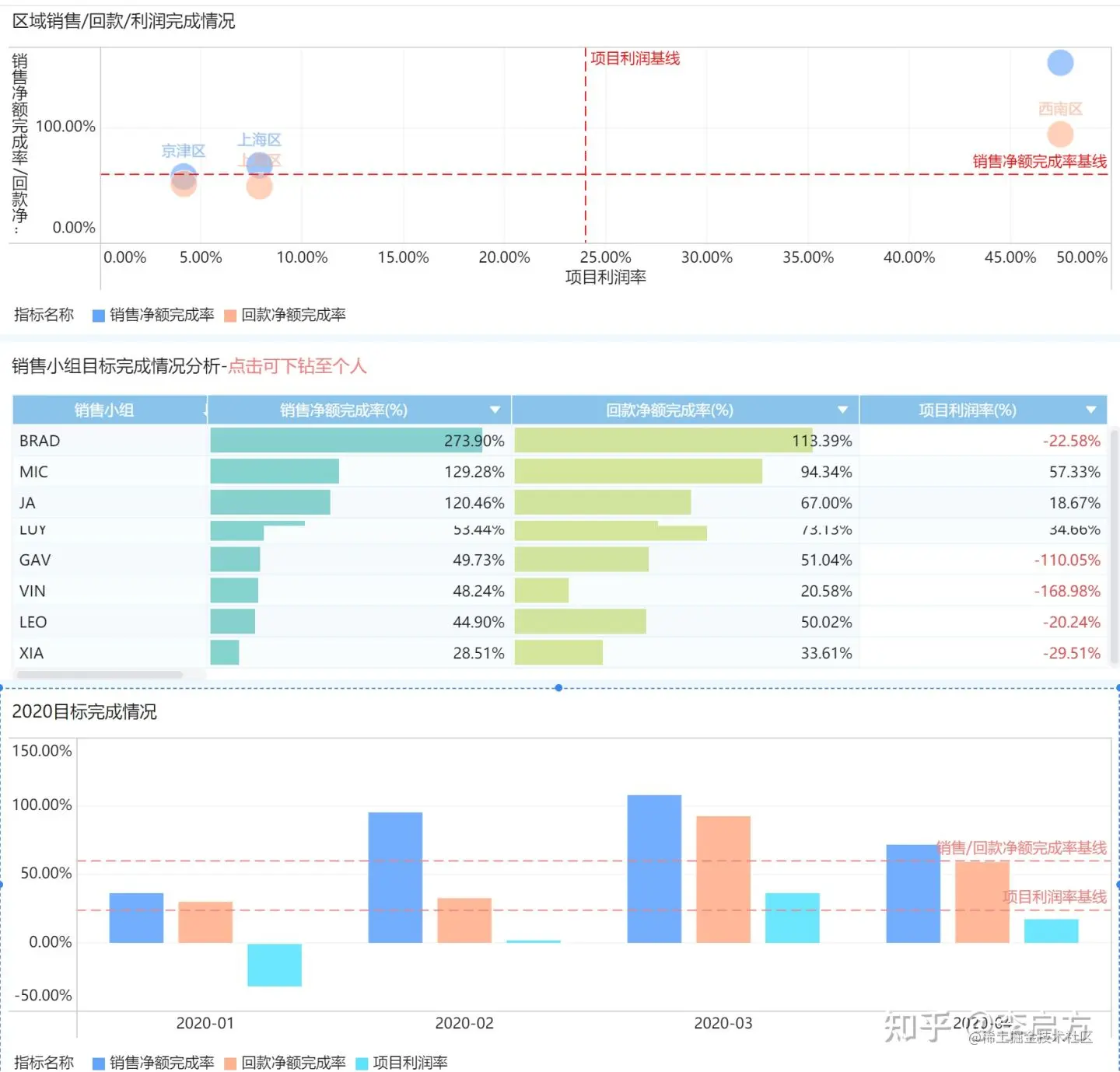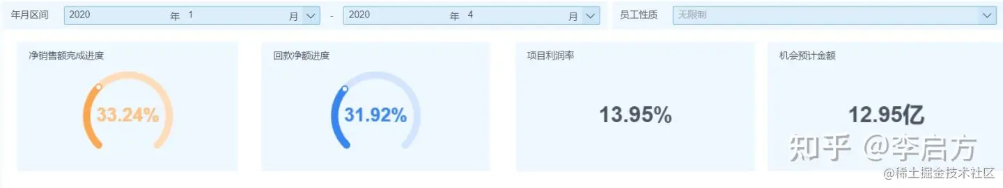报告首先给出营销线关键绩效指标 ①净销售额完成进度 ②回款净额进度 ③项目利润率及机会预计金额,如下图