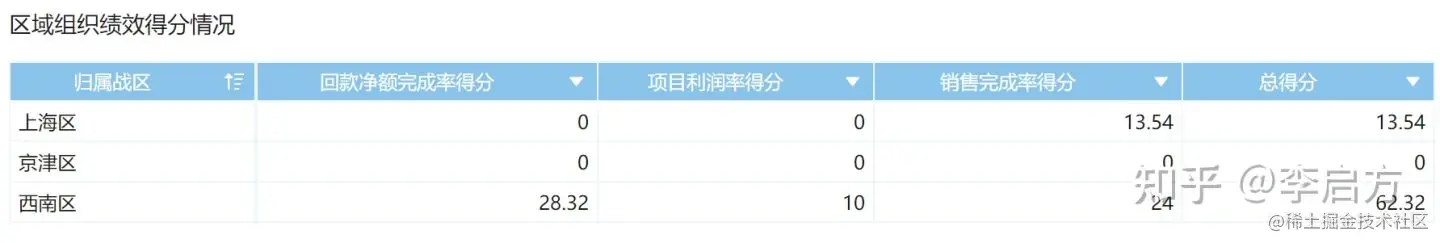 小组综合完成情况是指销售净额、回款净额、利润率都高,而不仅仅是其中一个指标优秀,因此就需要有一个可以计算综合完成情况的指标。例如得分数据,如下图所示: