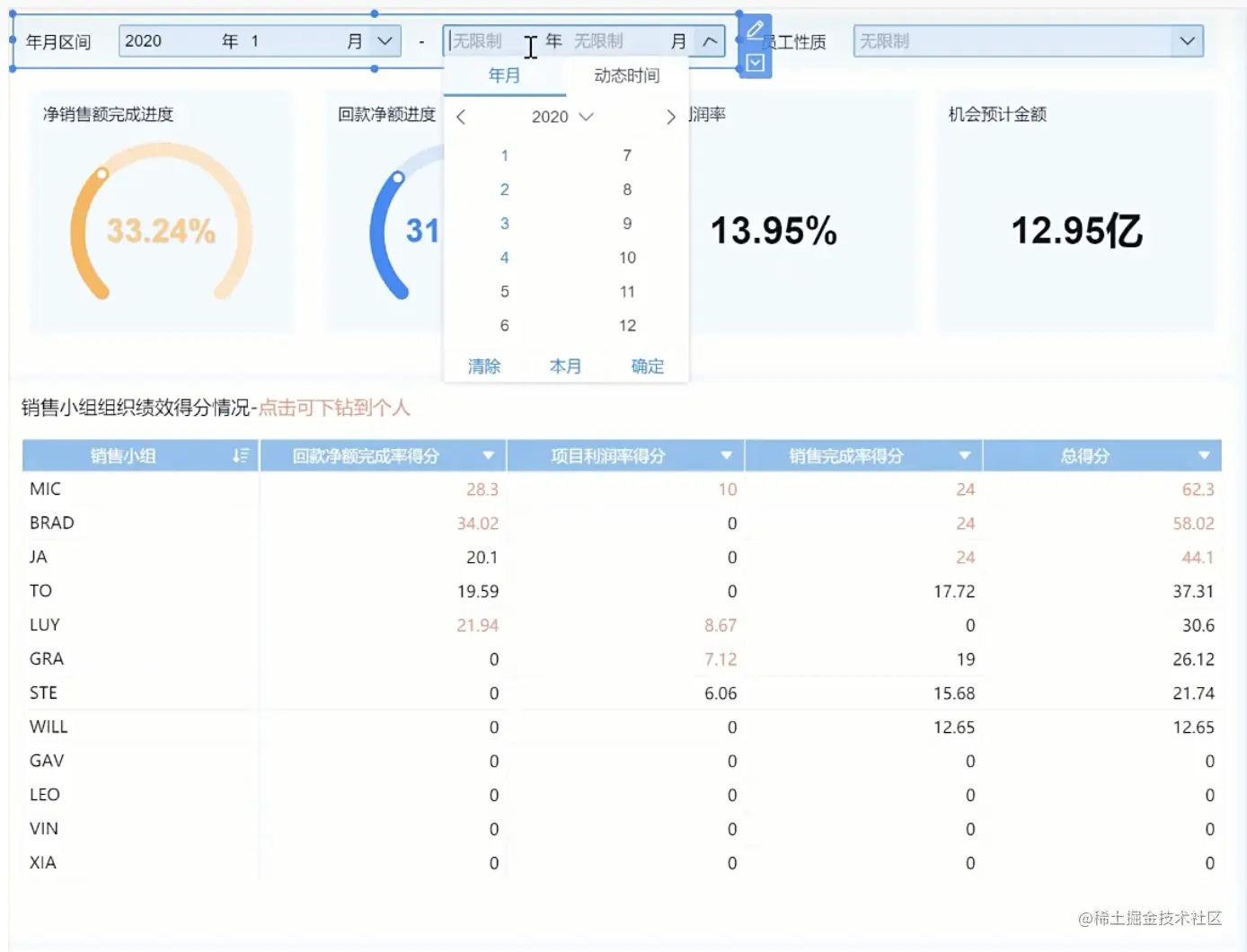 则根据区域、小组、个人、以及月度时间四个维度查看目标差异值,如下图: