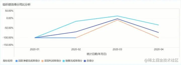 总体来看,四个月份的组织绩效完成情况相比2019年呈同比下降趋势。销售完成率得分情况相对稍好,回款和利润情况不容乐观,需要催促回款,并且控制项目成本。