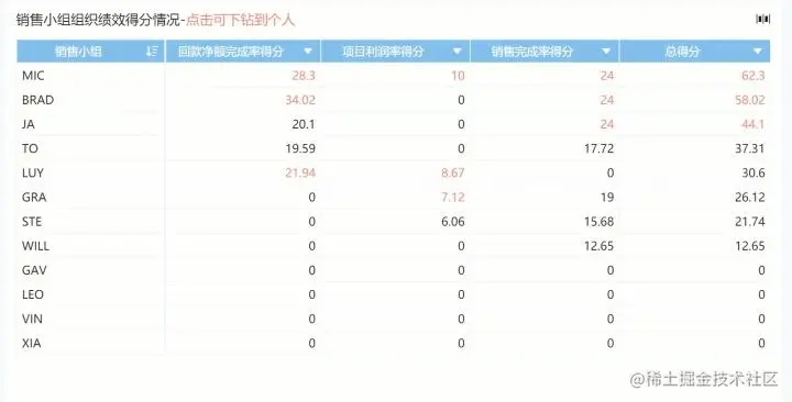 通过上述计算的销售任务、回款、项目利润率占不同的权重,进行加权计算得到综合完成情况,然后即可对不同小组和个人进行评价。例如展示销售小组每个指标的得分情况和总加权得分情况,点击对应销售小组和下钻到「销售个人」,如下图所示: