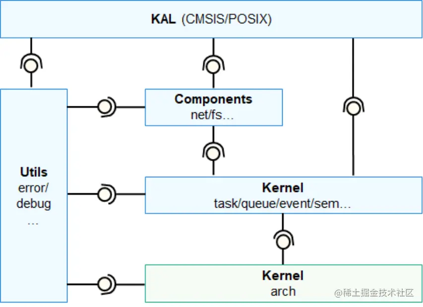 OpenHarmony作为一款万物互联的操作系统,覆盖了从嵌入式实时物联网操作系统到移动操作系统的全覆盖,其中内核包括LiteOS-M,LiteOS-A和Linux。LiteOS-M内核是面向IoT领域构建的轻量级物联网操作系统内核,主要面向没有MMU的处理器,架构如图1-1所示。