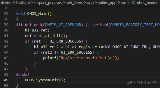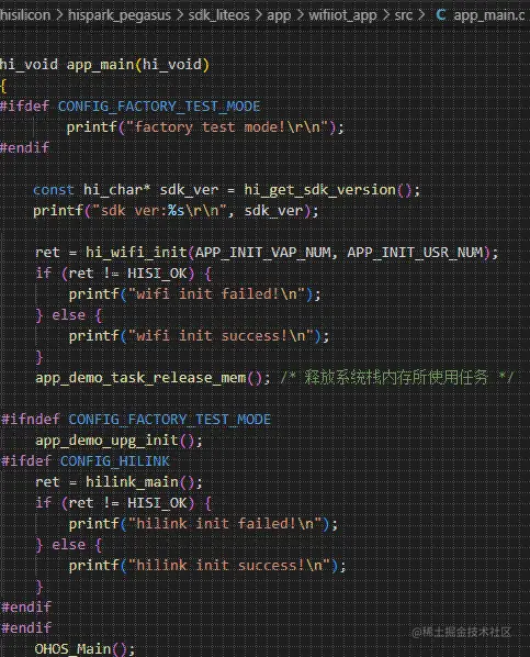 - 从AppInit开始脱离了sdk,可以看到源代码了,AppInit函数位于libwifiiot_app.a(app_main.o)中,部分截图如图4-3,源代码为app_main.c,其中调用的函数包括获取sdk版本号,外设初始化,ipc初始化,flash分区,WiFi初始化,tcp/ip初始化,然后跳转到了OpenHarmony特有的函数OHOS_Main。