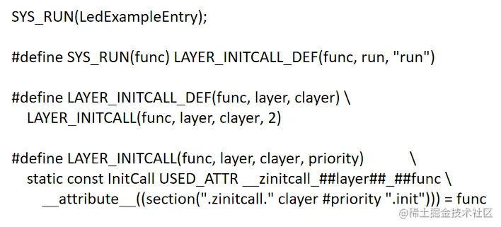 - 从运行角度看启动中调用到了应用程序led_exapmle,所谓位置为.zinitcall.run2.init,但我们在应用程序中的关联函数是SYS_RUN(LedExampleEntry),SYS_RUN的展开关系如图5-3所示,最终即是 zinitcall.run2.init,和程序运行时候的调用匹配在一起了。应用程序的调用关系就是编译链接阶段生成指定的段,初始化时调用指定段,这样实现了LiteOS-M的操作系统代码与应用程序代码的解耦。