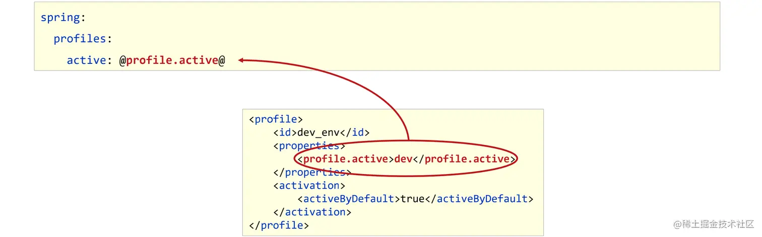 - 当主环境dev与其他环境有相同属性时,主环境属性生效;其他环境中有相同属性时,最后加载的环境属性生效