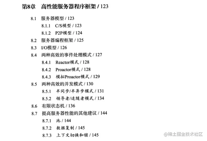 - 第二部分(第8章)探讨高性能服务器程序的一般框架。在这一部分中,我们将服务器程序解构为IO单元、逻辑单元和存储单元三个部件,并重点介绍了LO单元、逻辑单元的几种高效实现模式。此外,我们还探讨了提高服务器性能的其他建议。