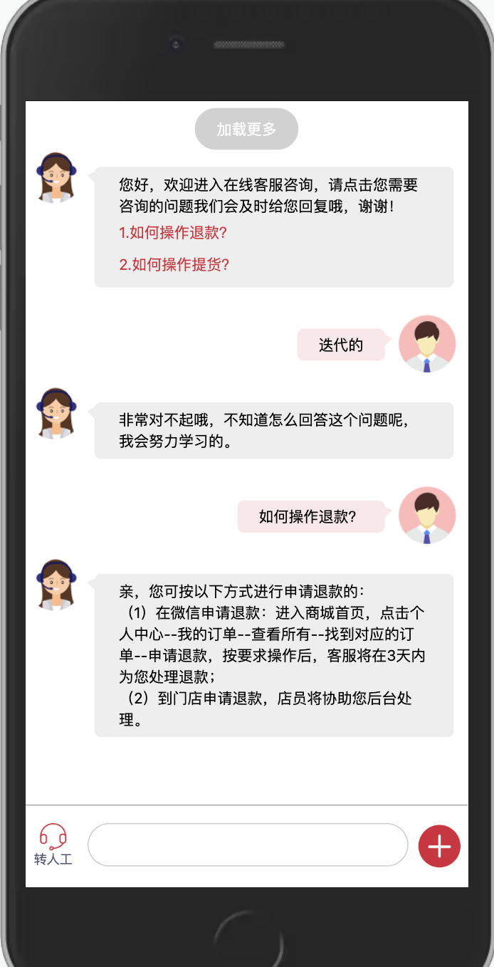 如果客服已经在线了,就可以转人工和客服聊天了,