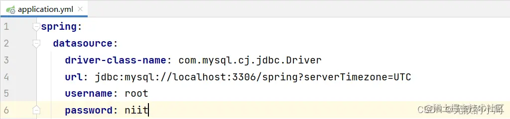 spring: datasource: driver-class-name: com.mysql.cj.jdbc.Driver url: jdbc:mysql://localhost:3306/spring?serverTimezone=UTC username: root password: niit type: com.alibaba.druid.pool.DruidDataSource