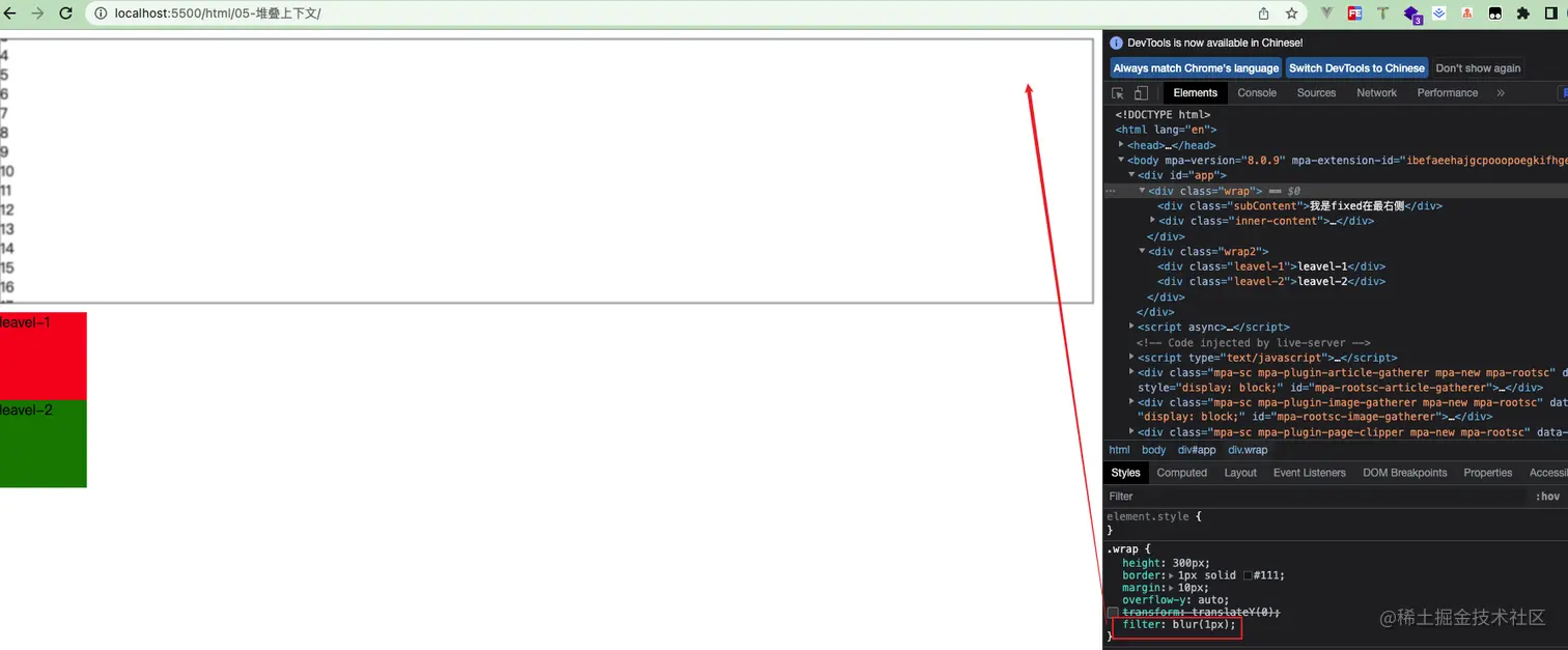 不知道你注意到没,其实filter也是和transform一样会产生堆叠上下文,如果子元素被包裹,父级元素设置filter,那么子级元素的fixed也会失效
