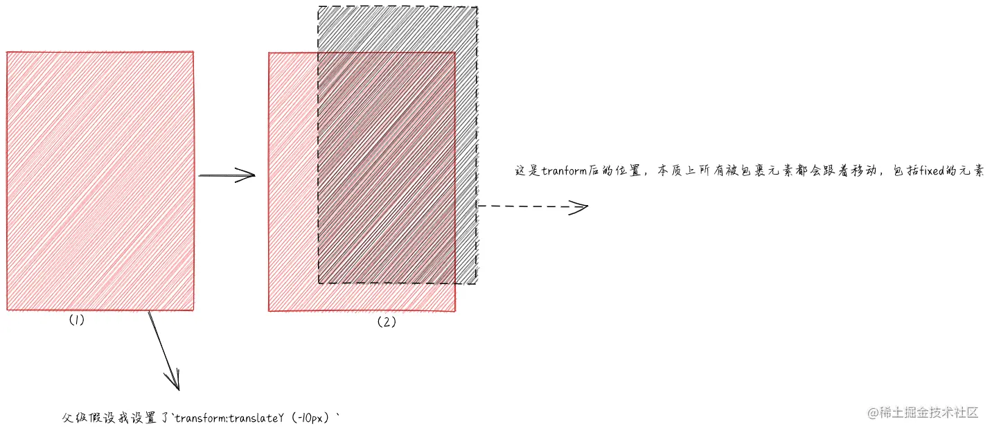 因为外层父元素设置了transfrom产生了堆叠上下文,而它子元素又想逃脱出去,儿子想造反给自己设置fixed产生一个堆叠上下文,对不起,你必须听老子的,所以子元素设置的fixed就失效了,你还是得跟着老子走