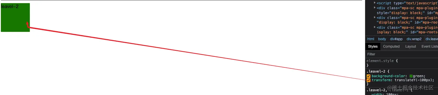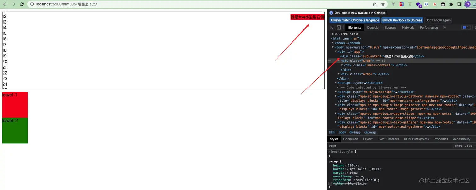 我们会发现此时leavel-2就把leavel-1完全盖住,因此transform也可以产生堆叠上下文,但实际上这个特性并不是像前面两个一样,并不会破坏文档流,所以这是一个例外,他只是改变自身位置,从而形成了堆叠上下文