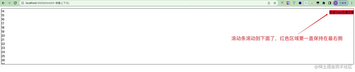 我们知道我给了.subContent的样式是fixed,fixed是相对整个body的,所以此时当你滚动内容时,会一直固定在最右侧
