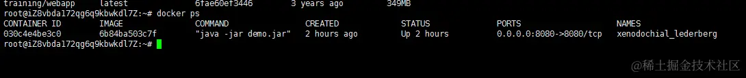 执行docker ps可以看到,镜像已经生产容器开始运行: