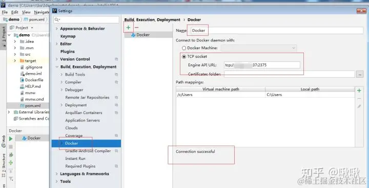 重启后配置docker,连接到远程docker服务。从File->Settings->Build,Execution,Deployment->Docker打开配置界面。