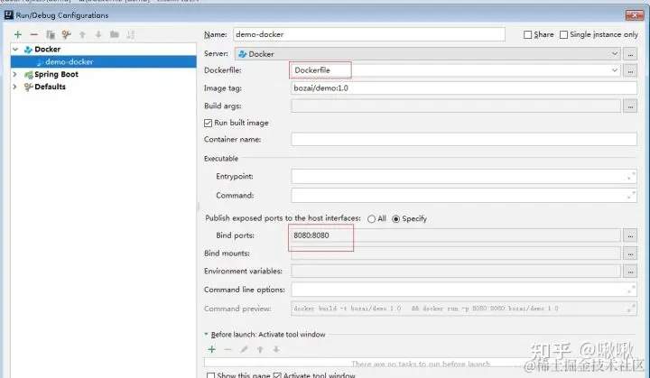 点击Docker,再点击+号,添加一个docker命令,输入Name,选择Server,选择Dockerfile文件,输入镜像tag,完成配置。