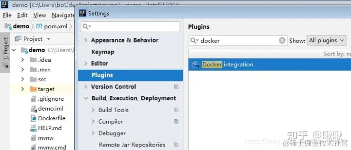 打开Idea,从File->Settings->Plugins->Install JetBrains plugin进入插件安装界面,在搜索框中输入docker,可以看到Docker integration,点击右边的Install按钮进行安装。安装后重启Idea。