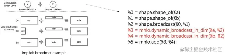 下图中展示了一个支持numpy语义implicit broadcast (IB)的Add OP的例子以说明计算图变复杂的具体过程。在IB语义下,Add OP在运行时会根据输入shape之间的关系,隐式的插入broadcast运算,所以下图左侧中展示的三种可能输入都是合法的。在静态shape语义下我们很容易在编译期就区分开实际是那种情况,故而在编译时只需要对一种具体情况进行处理,而在动态shape语义下,由于编译期间无法进行区分,我们需要确保编译的结果在三种情况下都可以工作,因而会在计算图中引入显示的shape 计算的IR以及broadcast操作(如下图右侧所示)。在这个例子中上层框架中一个普通的Add OP在动态shape语义下,也会被展开成一个复杂的子图。