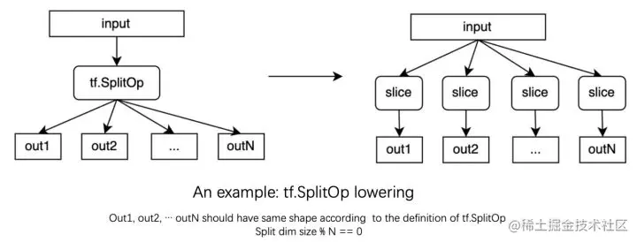 tf.SplitOp的例子。在这个例子中上层的tf.SplitOp会被lower成一系列的mhlo的SliceOp。根据tf.SplitOp的定义我们可以知道它的所有输出(假设有N个)应该具有相同的shape,且输入在被拆分的轴上的dimension size可以被N整除,这些信息在我们lower到mhlo时如果只进行data computation的转换,而不进行shape constraint信息的转换,将会被丢失,从而使得后续的pass无法再利用相应的信息进行优化;