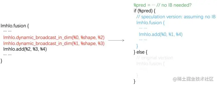 对于计算图化简而言,我们一方面可以通过利用shape结构化约束消除一部分的冗余计算,比如前文中提到的由于IB问题引入的大量broadcast op可以在计算图化简中消除。剩下的无法利用shape结构化约束消除的broadcast可以进一步利用以下shape分布约束进行优化:IB触发(即需要插入隐式的broadcast)的概率远小于IB不触发的概率。通过生成带IB和不带IB两个版本的(如下图所示),让common case变得更快,从而提升期望性能;