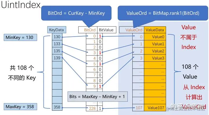 图中的 ValueOrd 就是前面说的 内部ID,Index 共有 108 个 Key,BitMap 中有 MaxKey - MinKey + 1 = 229 个 Bit。