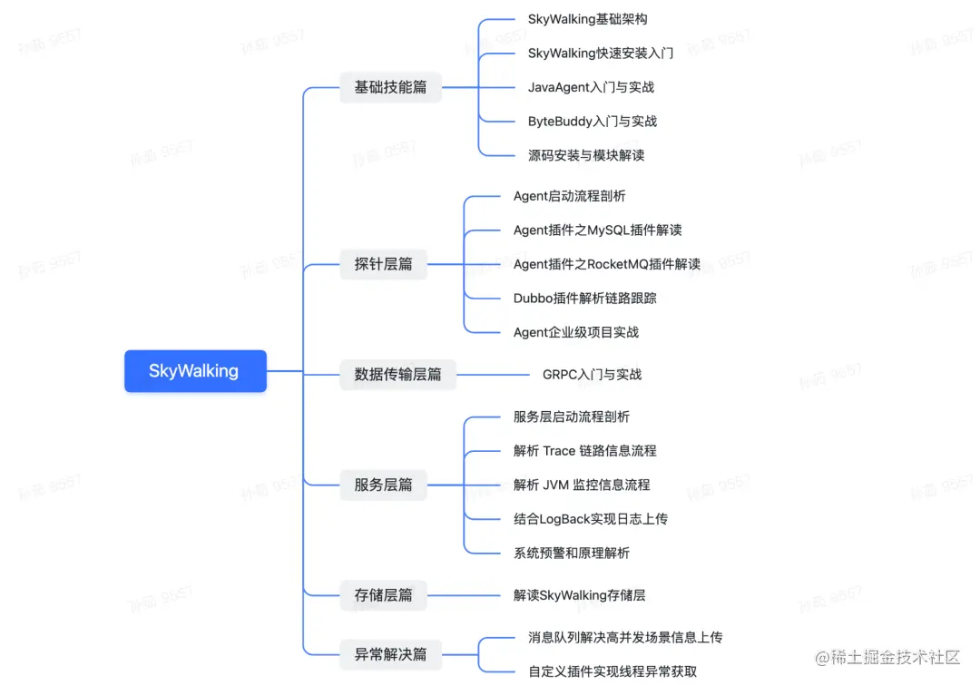 - 探针篇,会了解到 SkyWalking 的核心:Agent。通过剖析 Agent 启动流程了解什么是插拔式架构;通过各种插件的原理解读,了解链路跟踪的实现;最后通过项目实战加深理解。