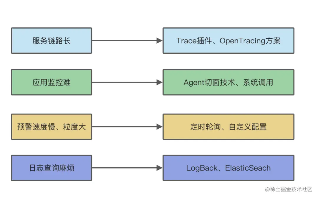 - 预警速度慢、粒度大:当生产环境出现服务超时、宕机等问题时,不能在第一时间察觉,经常需要人工反馈,但那时候已为时已晚。并且很多工具往往只能提供服务器或者应用层面粒度的预警,对于接口 RT、数据库响应的预警上就开始力不从心了。