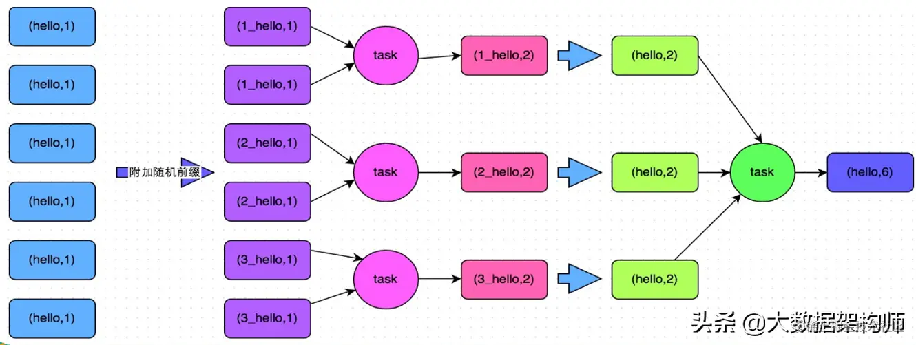 实现原理:将原本相同的key通过附加随机前缀的方式,变成多个不同的key,就可以让原本被一个task处理的数据分散到多个task上去做局部聚合,进而解决单个task处理数据量过多的问题。接着去除掉随机前缀,再次进行全局聚合,就可以得到最终的结果。具体原理见下图。