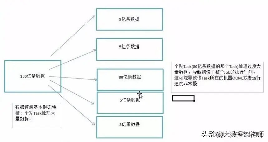 主要是发生在Shuffle阶段。同样Key的数据条数太多了。导致了某个key(下图中的80亿条)所在的Task数据量太大了。远远超过其他Task所处理的数据量。