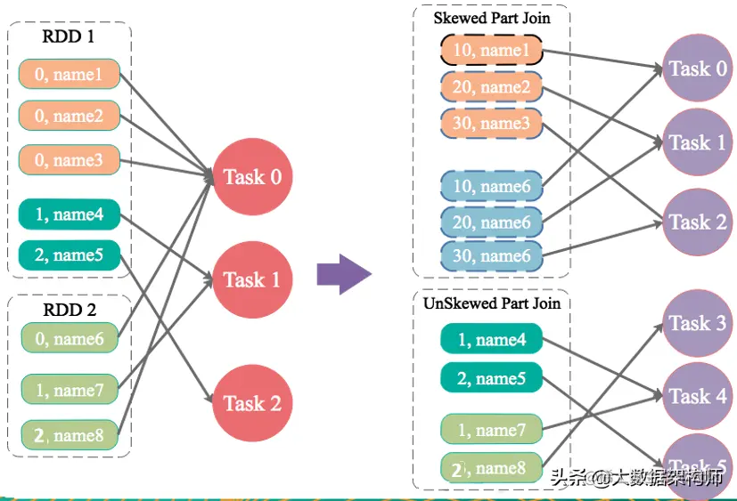 适用场景:两张表都比较大,无法使用Map侧Join。其中一个RDD有少数几个Key的数据量过大,另外一个RDD的Key分布较为均匀。