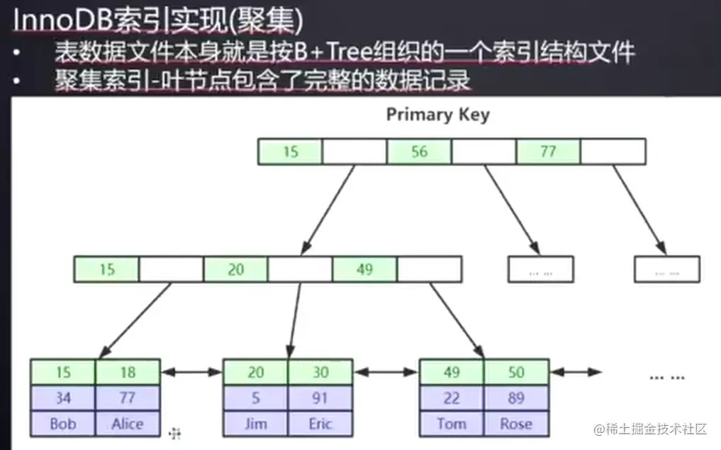InnoDB 整个表的数据就是用B+ 树组织的,如果存在主键,就用主键为索引,叶子节点存储行数据