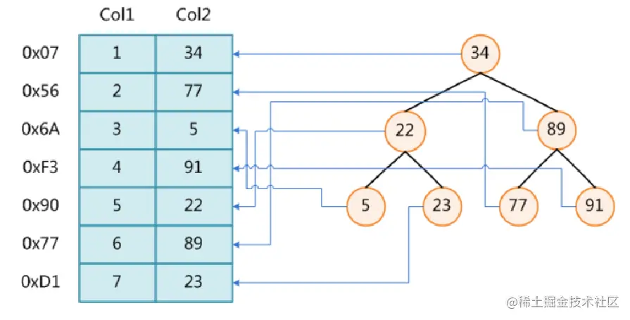 加入要找到 col2 = 23 的记录,如果不使用索引,我们需要对整张表扫描,从 34 -> 77 -> 5 -> 91 -> 22 -> 89 -> 23, 需要对比7次才能找到