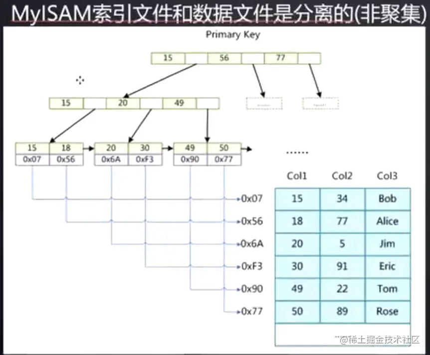 索引结构中的叶子节点的 data 存放的是 数据行的位置,及这一行在 MYD 文件的位置, 而不是直接放的真实数据