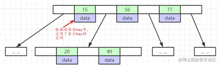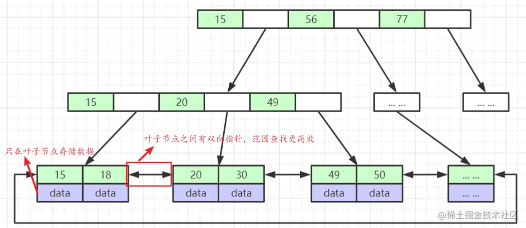 对于B+ 树,我们假设要查找50这个数据,先从根节点即(15 56 77) 这些数据中找到50所处的范围,因为 (15 56 77) 已经是有序的,可以根据二分查找算法找到 50 处于 15--56之间, 然后加载 15 所指向的下一页数据 (15 20 49),再次根据二分查找算法,找到50处于 49之后,再从磁盘加载49所指向的数据页,找到50